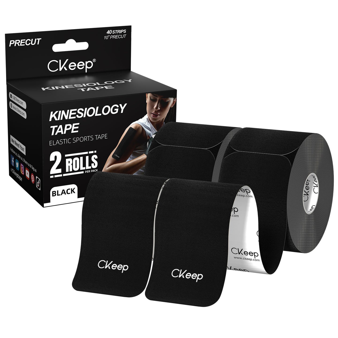 CKeep Kinesiology Tape, 2 Rolls Cotton Latex Free Hypoallergenic Elastic Precut Strips, 2 Inch Wide Waterproof Athletic Tape for Knees Pain Injuries Sprains, Black